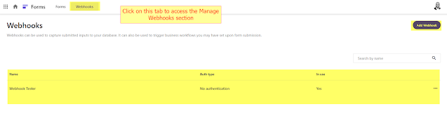 In addition you will have a table where you can see all created webhooks, see if they are in use on a form, rename or delete.